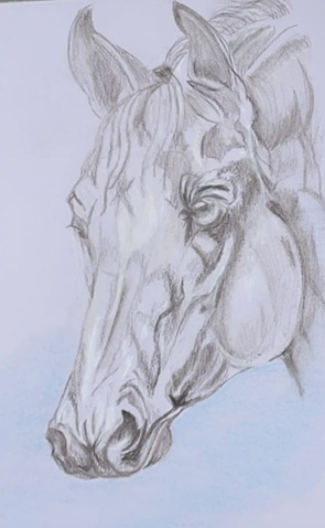 'Under the motto of 'I've never done it before, so I think I can,' I made the decision to draw a horse. It was certainly a challenging endeavor, as accurately portraying the muscles and shadows was crucial for achieving a semblance of realism. I dedicated a considerable amount of time to this drawing, but I'm pleased with the outcome.